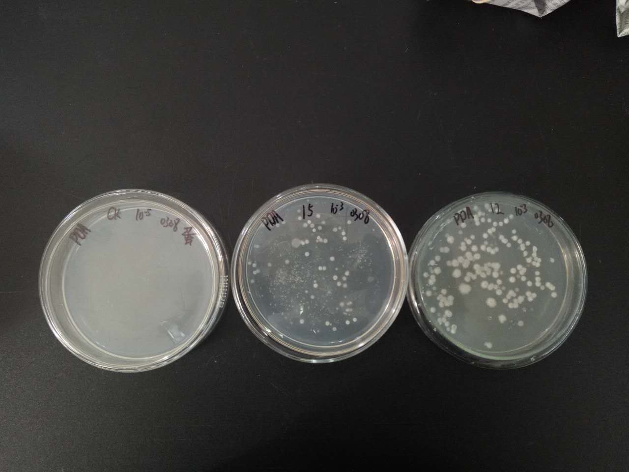沃土實(shí)驗(yàn)室對(duì)前期寄送的樣品進(jìn)行了多項(xiàng)指標(biāo)的測(cè)定,并進(jìn)行了菌劑接種和保存試驗(yàn)。試驗(yàn)基質(zhì)中接種了沃土的15個(gè)菌種,經(jīng)過(guò)30℃的恒溫培養(yǎng),1天后均繁殖出了菌落,其中尤以接種9號(hào)、10號(hào)和12號(hào)菌種的培養(yǎng)基質(zhì)菌落數(shù)量最多,而對(duì)照組(未接種菌劑)的基質(zhì)中沒有菌落出現(xiàn)。